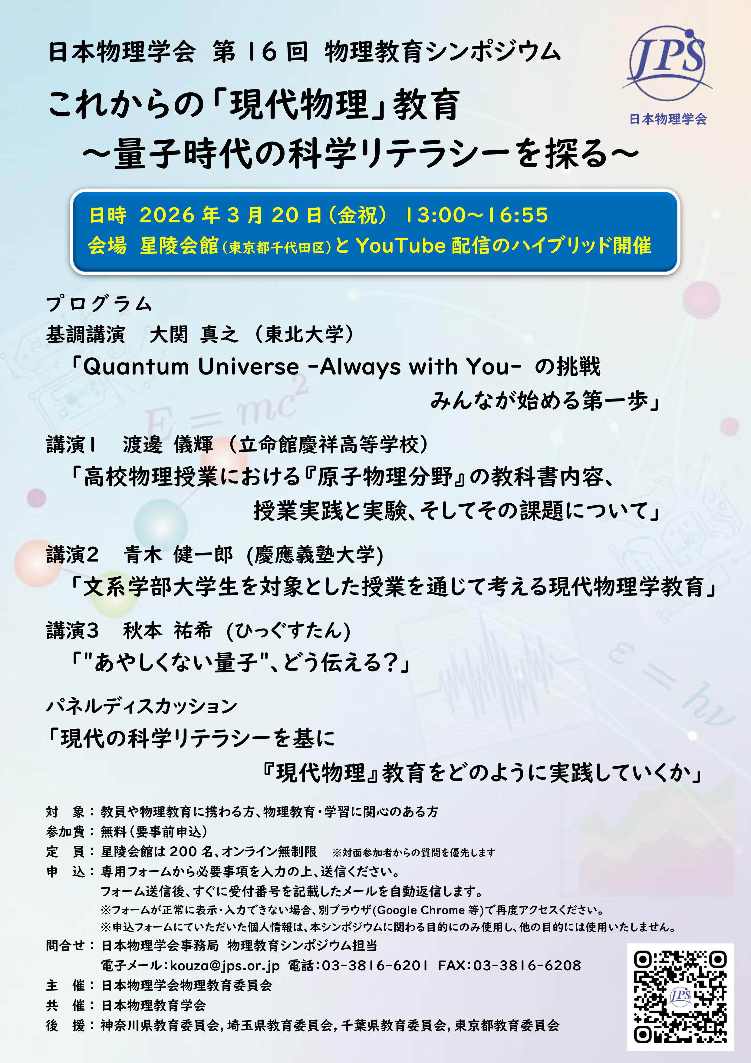 第16回物理教育シンポジウム「これからの「現代物理」教育 ~量子時代の科学リテラシーを探る~」