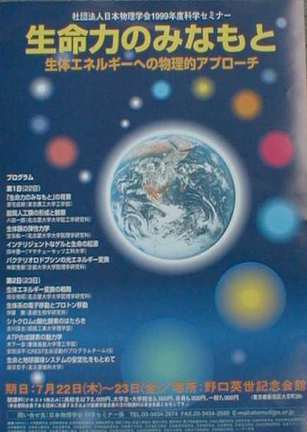 地球上のあらゆる生命体は、熱力学が教えるように、その生命活動を維持するために外界から絶え間なくエネルギ−をとりこみ、絶え間なくそれを消費しています。生物圏におけるエネルギ−の流入口は太陽光の捕獲です。植物や光合成細菌は最初にこの光エネルギ−を取り込んで、それを駆動力にして何段階もの化学反応を行い、高い化学エネルギ−を持った物質(ATPや糖など)に変えています。その元をたどれば、地球と生命の誕生以来、地球と生物の永い共進化の歴史があります。その結果、長大な食物連鎖が出来上がり、エネルギ−と物質のみごとにバランスのとれた循環系を成り立たせました。生命力は安定なエネルギ−のながれとバランスのとれた物質循環によって支えられています。しかしながら、活発な人間活動によってこの循環系が崩れようとしているのが現代です。この科学セミナ−「生命力のみなもと」では、太陽からのエネルギ−が生物分子の中に如何に取り入れられて、それによって生物内のエネルギ−変換のプロセスがどのようにしてひき起こされるかを紹介します。この問題はこれまでずっと生物の問題と思われていました。しかしながら、最近の生命科学の爆発的な進歩によって、それが物理の問題であり、化学の問題でもあることが明らかになってきました。生命力のしくみを理解することと現代のエネルギ−・環境問題を地球規模でとらえることは相つながっているものであり、それらが共にこれからの物理学を含む全ての科学の課題として重要になっていくものと思われます。この科学セミナ−は大きく分けて2つのパ−トからなります。第1のパ−トは生体膜の物理化学的性質についてであります。多くのエネルギ−変換のタンパク質複合体は、全て生体膜中に存在しています。従って、これらの分子機械を理解するには、それらのタンパク質が働く場である膜という構造体とタンパク質を含む高分子についての一般的なイメ−ジを持つことが必要です。膜はタンパク質よりはかなり小さな脂質分子が膜上に配列したものです。この脂質膜を主成分とする生体膜は、細胞の内外をはっきり区別するという意味では、丈夫な構造体なのですが、膜の面内方向には液体のような性質を持っている液晶的な興味深い物質です。膜の力学的な性質は細胞自体の性質にも深い関係があります。一方、タンパク質を構成するアミノ酸には電荷を持つもの、水に親和性のあるもの、水に溶けにくいものなど、様々なものがあります。一般に、高分子(およびゲル)は環境によって、非常に広がった状態と縮まった状態の相変化を示します。実際のタンパク質は後者のグロビュ−ル状態に相当します。このような生体膜についての物理化学的性質の最新の研究成果が報告されます。第2のパ−トでは、太陽からの光エネルギ−が生体エネルギ−に変えられて行くプロセスについて報告されます。たとえば、最近、光合成反応中心など光合成にかかわる巨大膜タンパク質複合体の立体構造が明らかにされました。現在ではそれを基にして分子間エネルギ−移動を詳細に実測したり計算できるようになりました。そして、光エネルギ−変換のメカニズムの中で中枢にあるのが、トンネル効果による電子移動という最も物理的な現象であることが分かってきました。反応中心やシトクロム酸化酵素で電子の移動とカップルしてプロトンが生体膜を横断して輸送され、プロトンの濃度勾配を作り、電気化学エネルギ−として安全に蓄積されるプロセスも次第に明らかにされてきました。この電気化学エネルギ−を用いてATP合成酵素でATPがつくられます。最近、ATP合成酵素でATPを合成する現場をとうとう画像でとらえることに成功しました。ATP合成酵素の中をプロトンが走り抜け、電気化学エネルギ−を放出する代わりに、酵素の膜外部分が分子モ−タのごとくダイナミックスに回転する様子がとらえられたのです。これらの研究に対して、日本の生物物理の研究者が大きな貢献をしてきました。 最後に、現代の地球と全生物系に視点をおき、安定なエネルギ−のながれとバランスのとれた物質の循環系を維持するためには、人社会の進化が必要であることが主張されます。講師の人達は、最先端の研究成果をわかりやすく解説することに情熱を持った最高の科学者です。是非、標記セミナ−にご参加下さいますようお願い申し上げます。